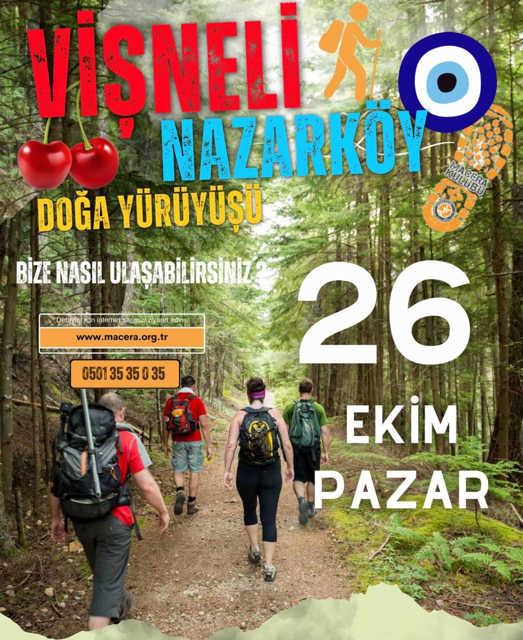Macera Kulübü olarak bu hafta Kemalpaşa Bölgesinde bulunan Vişneli Köyünden Nazarköy'e doğa yürüyüşü yapacağız. Yürüyüş sonunda nazarköyde bulunan boncuk atolyelerini gezebilir, alışveriş yapabilirsiniz. Görsel olarak oldukça doyurucu olan bu parkur bizim en sevdiklerimiz arasındadır.
